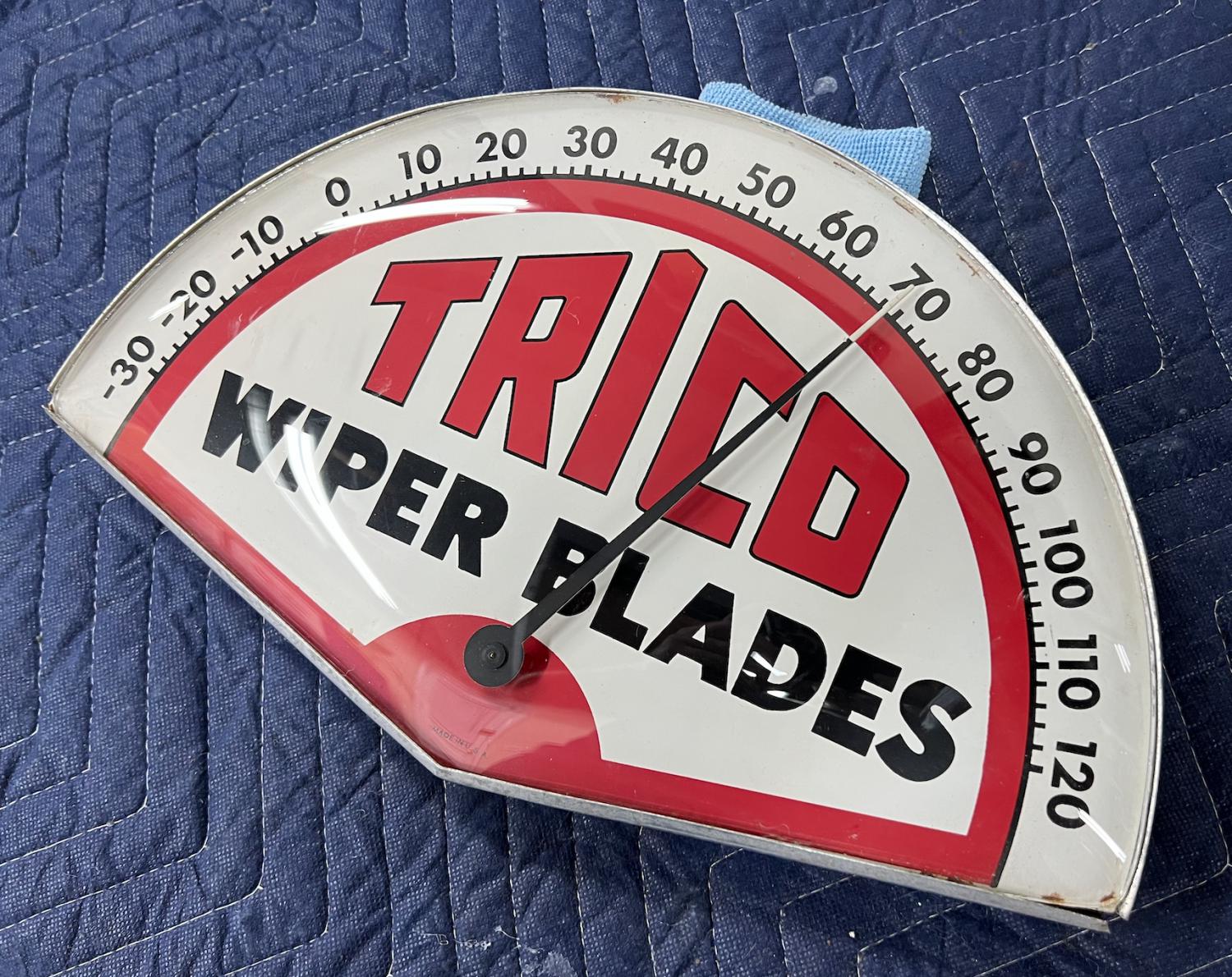 For sale is my original Trico Wiper Blades Thermometer. Made in USA. Unrestored and in great condition. Original colors/no touch up. Works accurately. 15 inches across and 9 inches tall.