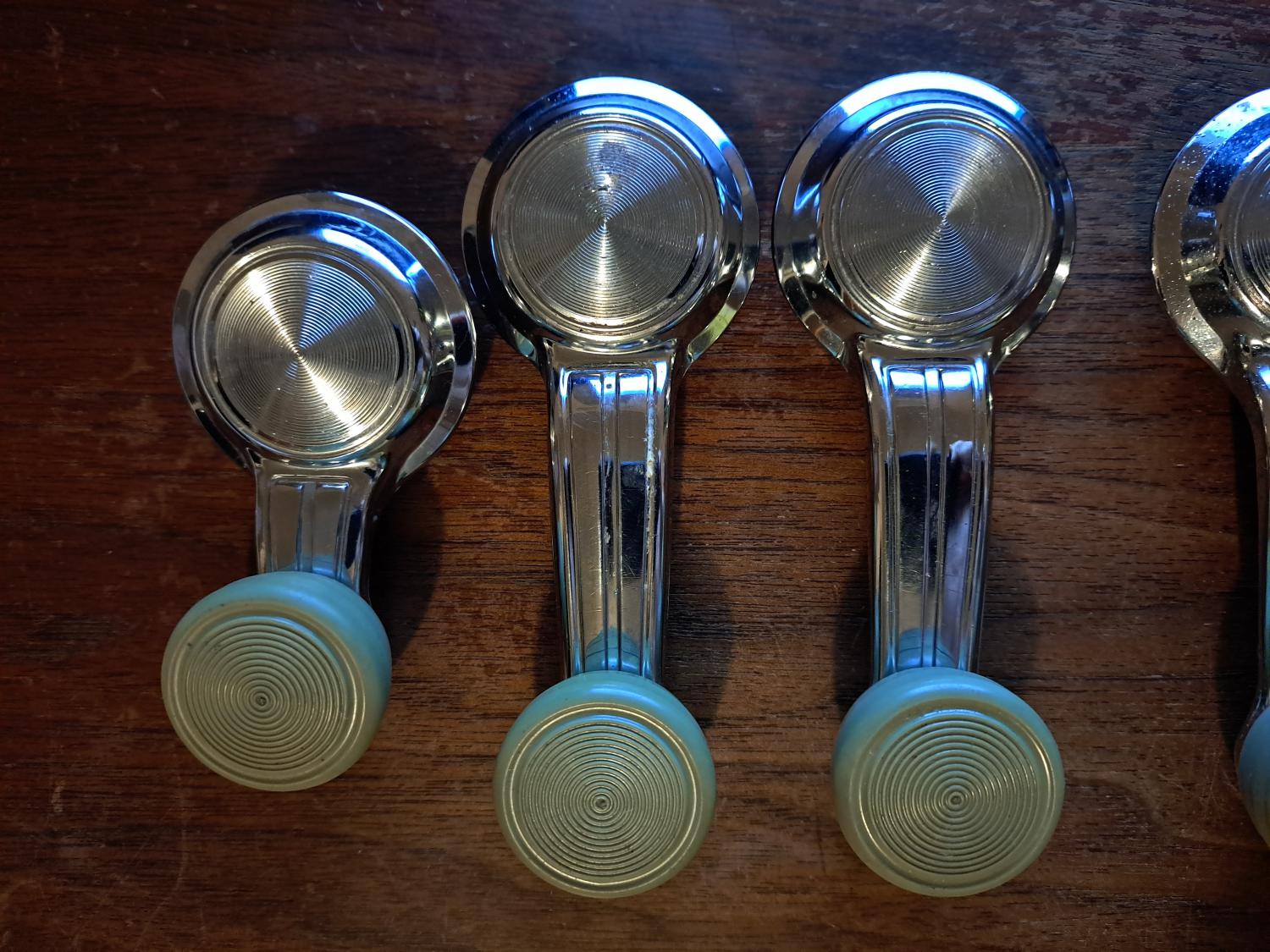 1. Complete set of six window cranks. I believe the color is turquoise but it may be blue. The two colors are very similar. Any color other than clear or black is very tough to find. The part numbers are 9715289 for the vent cranks and 9715191 for the window cranks. The chrome has some pitting as shown in the pictures. One knob has some play. The others are have very little play which is normal for this style window cranks. All cranks have the clips.