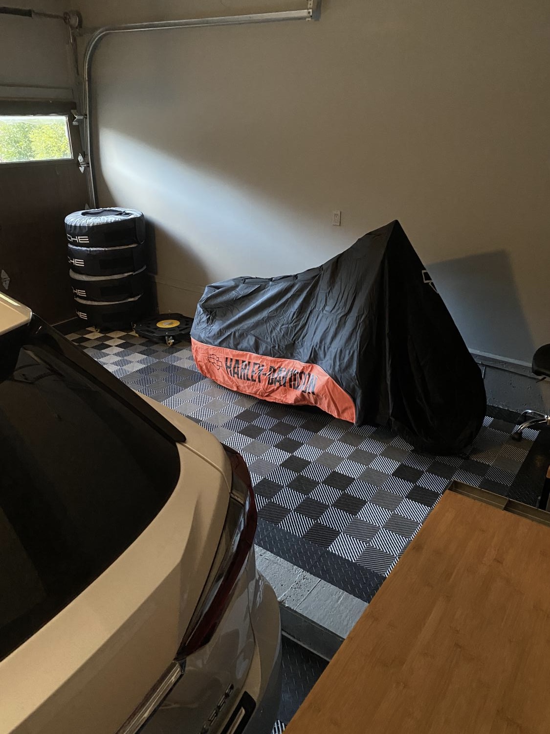 Florida dreaming. Bought a 6X10 trailer to take the Harley with this year. Testing where to place the trolley and install D rings.