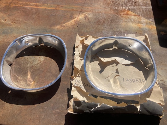 Selling a set of NOS headlight bezels for 70-73 Camaro. The packages crumbled but the one still has a number on it 3962944 as shown. These were purchased in the mid 70's by a guy and just sat in the garage. Will be listing a few other nos items from same estate. The price is 200 ppff shipped lower 48. Thanks. Larry 5203492337