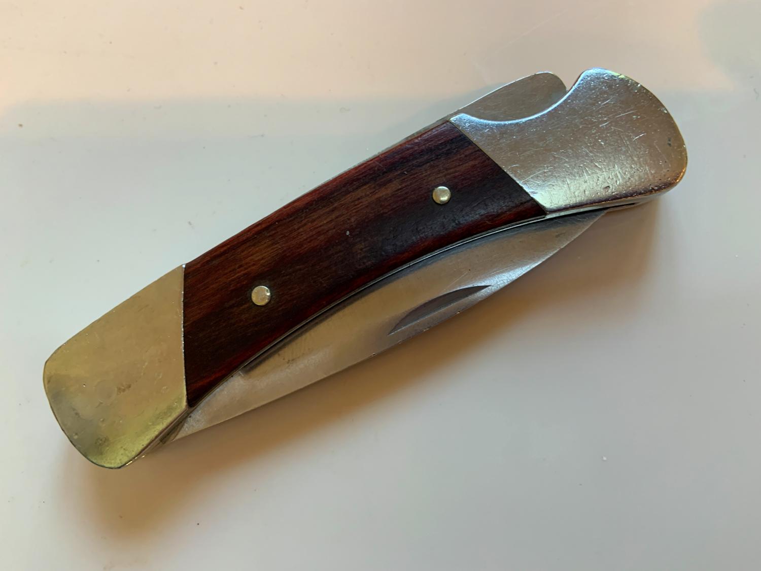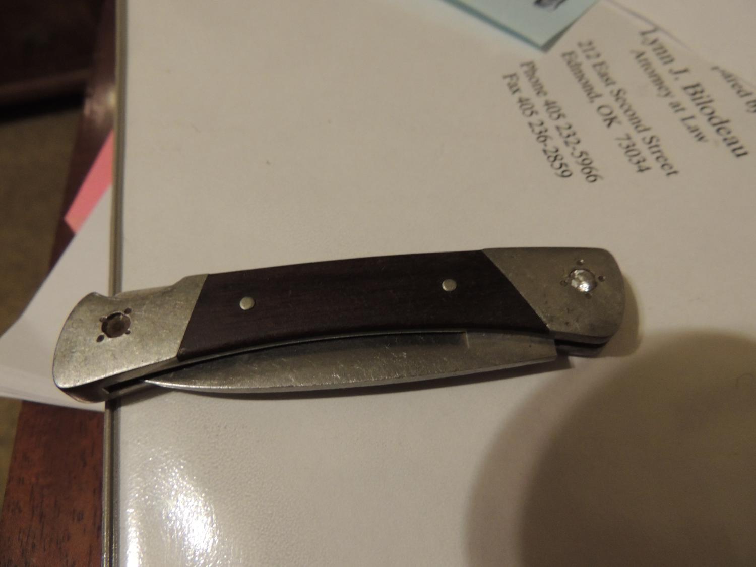In the same lot of stuff I acquired the oddball Craftsman ratchet, there were a couple of nice little pocket knives with locking blades; one is a Gerber, the other a Buck 503 Prince with Rosewood. The Buck knife has (or had.... two fell out) stones that look like diamonds imbedded into the metal ends. I cannot find anything like this on the web. You can see where little holes were drilled, stones inserted and then four stake marks to set the stone. Have a hard time believing someone would do that with real diamonds. One off?
