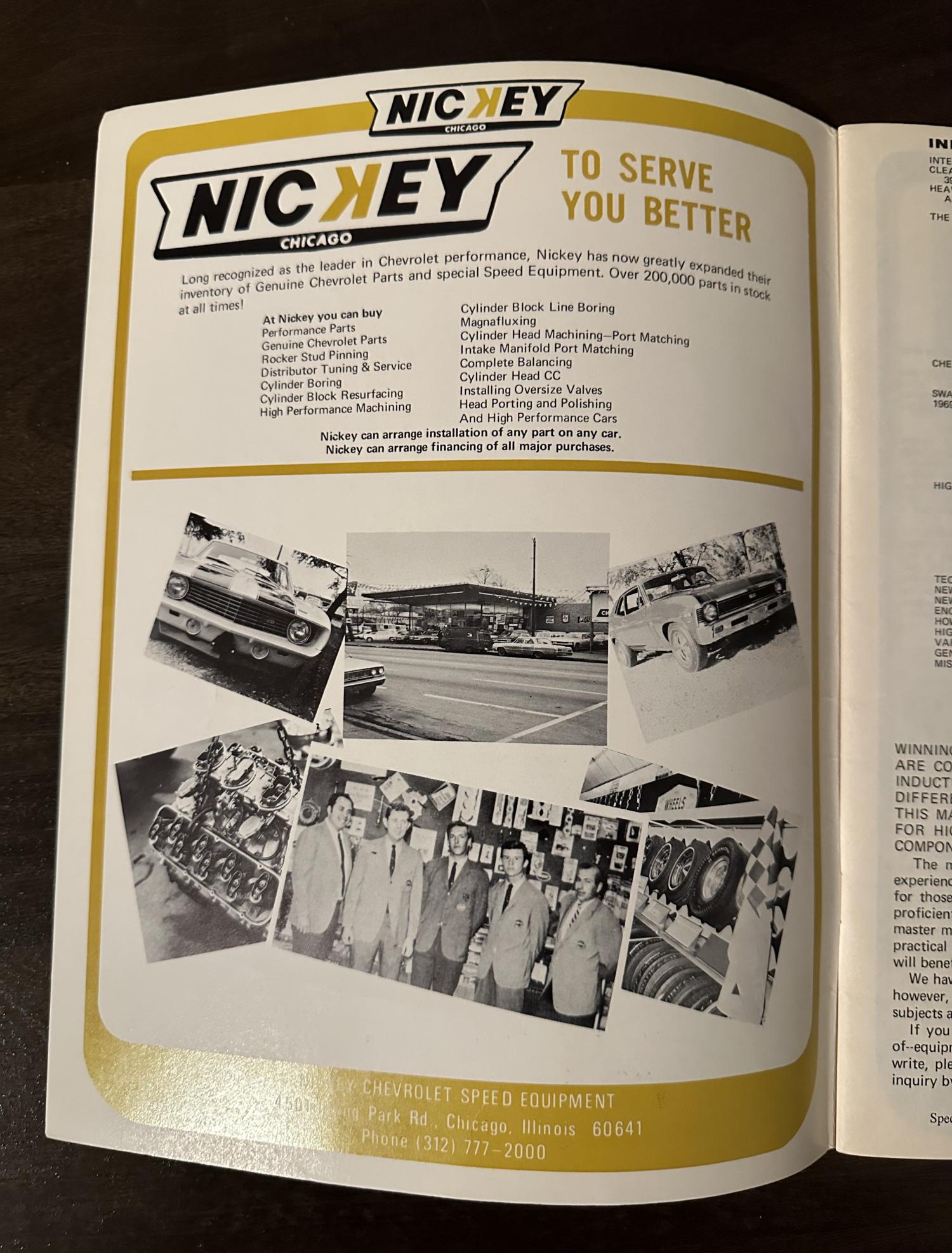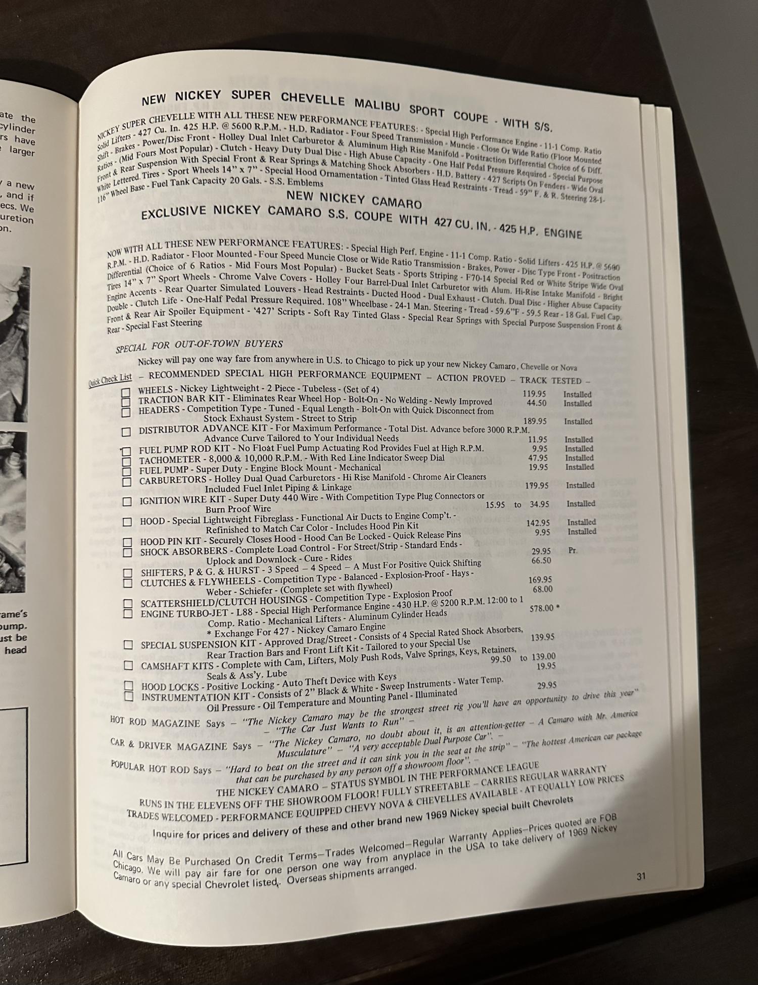 Nickey Chevrolet Special High Performance Manual. This catalog is in near NOS condition. One of the nicest I’ve seen. 47 pages with no rips, writing or issues anywhere. Perfect condition. Tons of great information and photos.