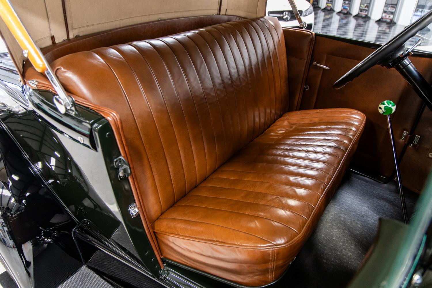 From the information gathered this car is believed to have 17,649 original miles. It was the product of a frame off restoration but it's unclear when the restoration was completed. The restoration was done a higher level then what is typically found of Model A restorations. The exterior presents beautifully with excellent attention to detail throughout. The body is straight and the panels align properly throughout. The hood, doors and rumble seat close very nicely. The body was re-finished in Brewster Green with black fenders, running boards and accessory trunk compartment. It's believed to be the original color combination. The paint was decorated with Apple Green pin striping which complements the color theme. The lacquer paint does have some minor imprefections but still shines beautifully. It was recently detailed by the team at MS CLASSIC CARS. The tan canvas soft convertible top is trimmed with brown leather and has a glass rear window that's trimmed with stainless trim. The folding convertible top frame is decorated with wood accents. The top fits well and is easy to operate.