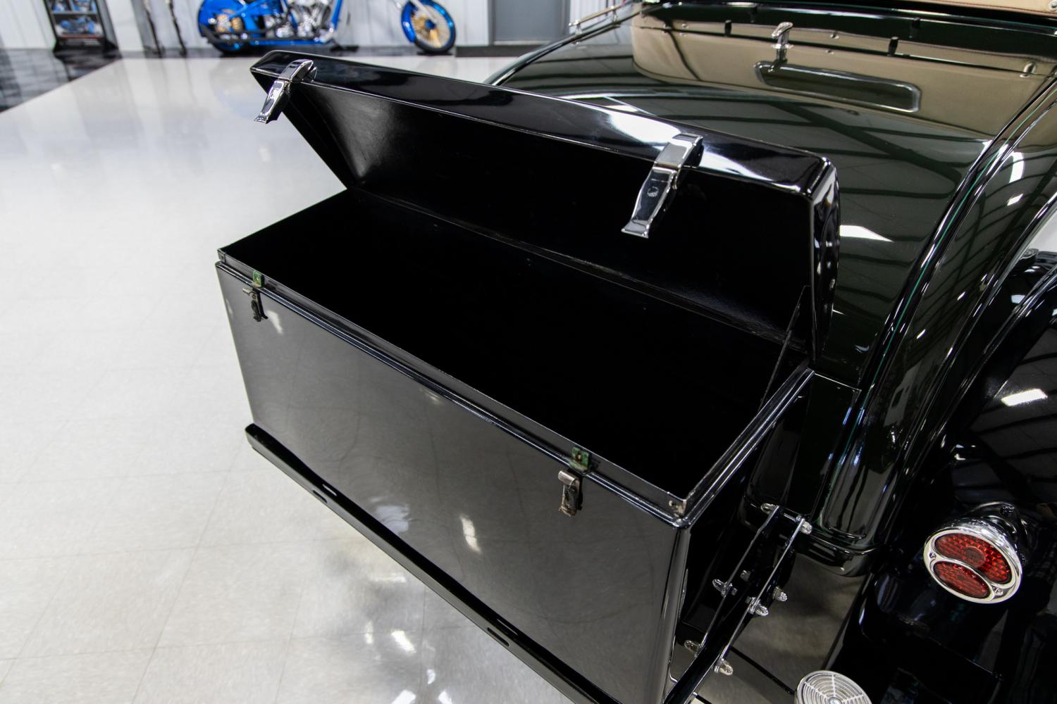 The simple designed interior is surprising spacious. The dash was re-finished in Brewster Green with subtle Apple Green pin striping. The kick panels, door panels and hinge straps, rear panels, rear shelve and bench seat was re-upholstered with Brown pleated leather. Everything in the interior was restored or replaced such as the rear view mirror, windshield wiper, dash bezel and instruments, knobs, steering wheel, pedals, flooring pieces and rubber floor mat. The floor shifter was outfitted with a Green swirl glass shift knob which was a dealer accessory. The rear rumble seat was also re-upholstered with Brown pleated leather. The original matching factory accessory trunk compartment is in excellent condition and fully functional.