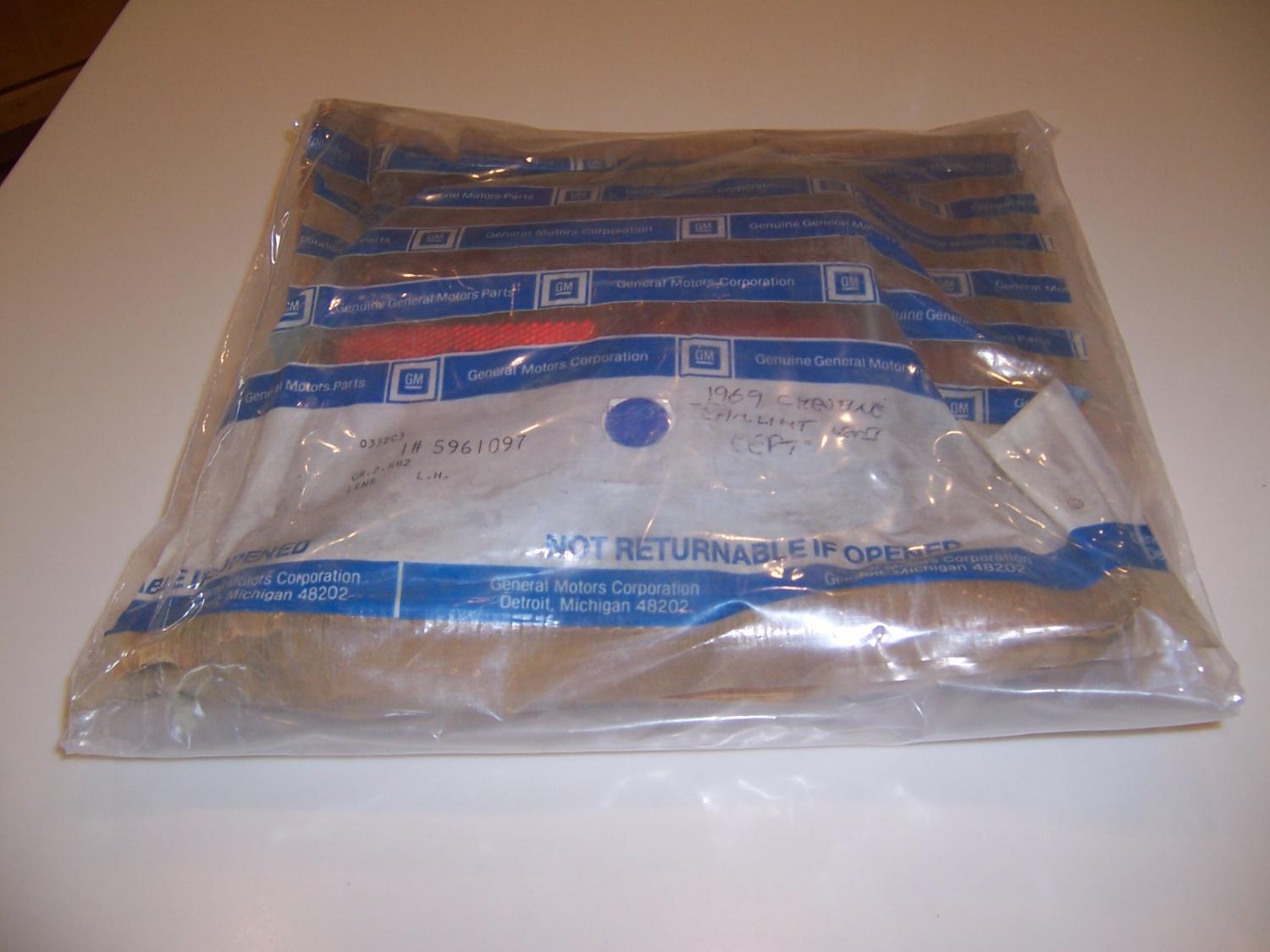 I currently have on eBay a NOS GM taillight lens for a 1969 Chevelle, p/n 5961097. This is the left side (drivers side) lens. It is brand new, still in the original factory packaging, which has then been kept in a heavy plastic Ziploc bag ever since I have owned it, which is over 20 years now. Removed from the packaging only for the pictures. Perfect for your finely restored 69 Chevelle, when only original GM parts will do. I have the matching right side lens in equally perfect NOS condition in a separate auction that is running currently. Both of them are being offered with a $9.99 minimum bid and NO RESERVE.