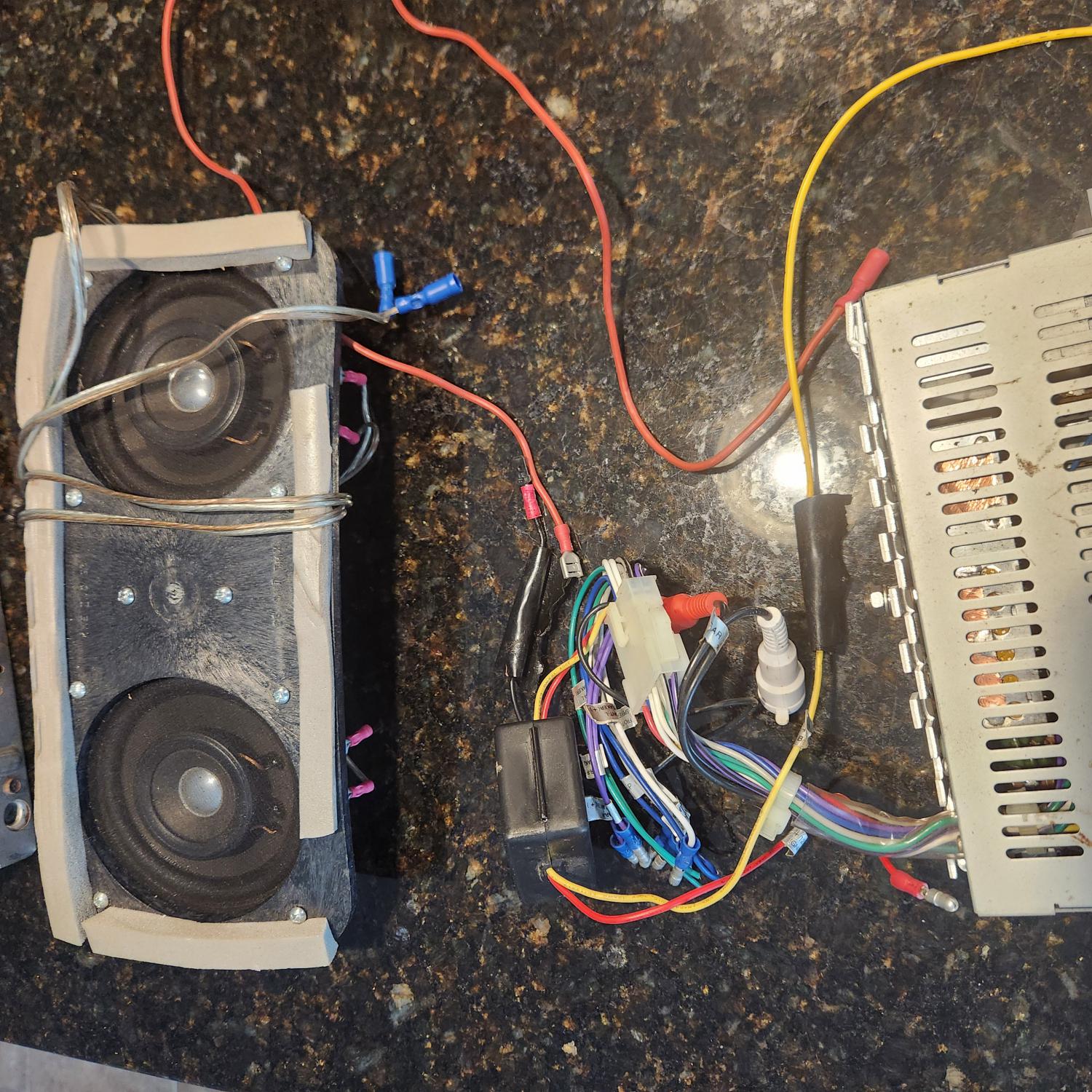 2) Removed this hideous aftermarket am/fm cassette. Luckily nothing was hacked up when installed. It was a rats nest of wires. There something about removing incorrect items and reconfiguring to how it left the factory which was AM with rear speaker. I just sent the front and rear speaker to Jackson Speaker for reconing. Once I get the speakers back reinstallation begins!!