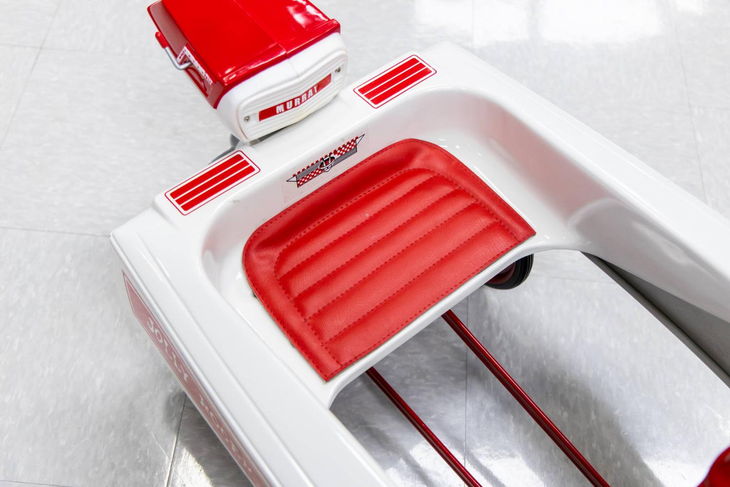 This example was completely restored to show quality standards. During the restoration process the body was made straight and painted white. It was decorated with red decals including the Jolly Roger red side decals. It was outfitted with a new wraparound windshield, chrome plated bow rail and bow staff with pennant. The flashing navigation light wasn't added during the restoration process. This piece is readily available if the new owner decides to add it. The roomy contoured cockpit features a red steering wheel and padded seat. The pedal assembly was painted red and new rubber pedals were added. The decision was made to paint the 8” wheels red with a white pinstripe which really adds to the character of the piece. The wheels have new moulded tires. The functioning outboard motor actuates the propeller and requires 2 “D” type batteries.