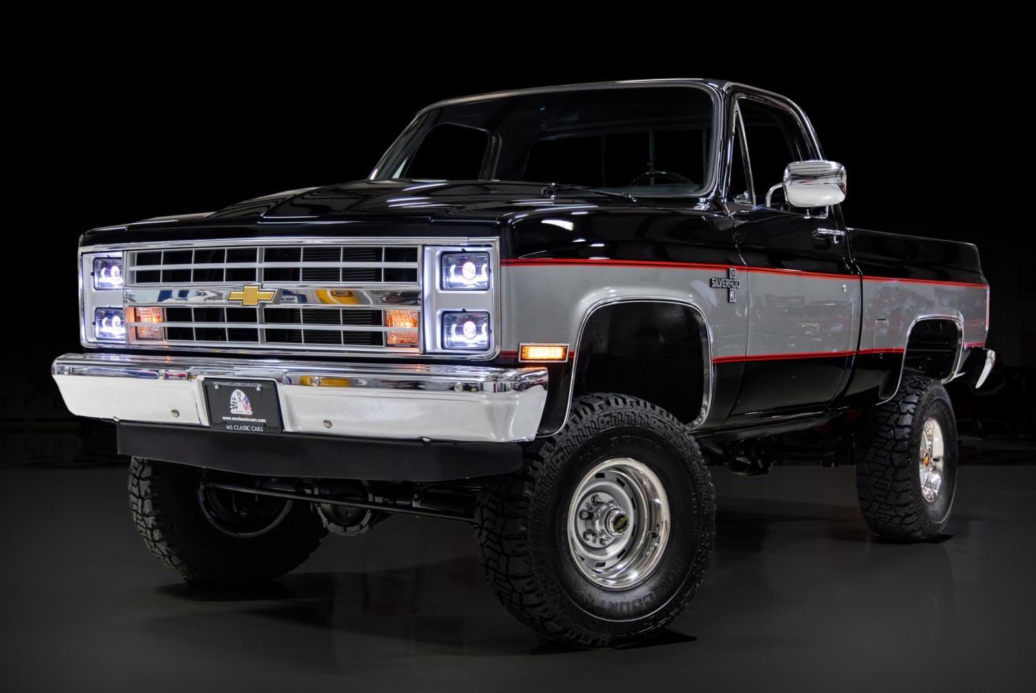 Selling with NO RESERVE at Barrett-Jackson, Scottsdale, Arizona, October 10-13. **THIS VEHICLE IS SELLING WITH NO RESERVE AT THE UPCOMING BARRETT JACKSON AUCTION BEING HELD IN SCOTTSDALE, AZ OCTOBER 10-13. IT'S SELLING ON FRIDAY OCTOBER 11TH – LOT #483. IF YOU'RE INTERESTED IN PURCHASING PLEASE REGISTER TO BID DIRECTLY WITH BARRETT JACKSON. IT'S A QUICK AND SIMPLE PROCESS. YOU CAN BID IN PERSON, OVER THE PHONE OR ONLINE. PLEASE CALL WITH ANY QUESTIONS. THANK YOU.** This super looking 1984 Chevrolet K10 4x4 square body pickup has been tastefully restored with many custom features. It's powered by a modern LM7 V8 and 4L60E automatic transmission. The frame off restoration was done over a one year timeframe by Daniel Turcotte of Johnston, RI and completed in early 2020. Since completion it's been admired and driven roughly 500 miles on special occasions. The original body was stripped to bare metal and a custom cowl hood was added for a more aggressive appearance. The straight body was refinished in its original color combination of Black and Silver. The colors are separated with dual red pinstripes. The show quality paint was recently detailed to a glossy finish. Silverado badging was added to the front fenders. It has a new front windshield and C.R. Laurence sliding rear window. Everything on the exterior has been restored or replaced including the dual chrome mirrors, grille, front bumper, moldings, door handles and bumpers. It's equipped with modern LED headlights and sequential taillights. It rolls on the original restored 15” silver finished wheels that are wrapped in Dick Cepex Fun Country 33x12.50x15 tires. The interior was restored in the original color of black. It was wrapped with Dynamat insulation for soundproofing prior to reinstalling everything. Some of the new trim includes the headliner, dash, door panels, bench seat upholstery and carpeting. Some interior features include a tilt steering column, 15.5” Billet Specialties Tec 5 contrast cut steering wheel, black aluminum shift handle, Kenwood stereo with remote and custom floor mats. The bed was rhino lined for durability and the floor is covered with a rubber mat. The engine compartment is nicely detailed throughout. The firewall, inner fenders and radiator support was refinished in satin black. The heart of this K10 is a LM7 5.3L Vortec 5300 engine that runs excellent. The engine was outfitted with a custom black intake, 102mm throttle body, ICT billet bracket and polished air intake tube. The battery has a power disconnect knob for storage. The engine is cooled by an aluminum radiator with dual electric fans. The engine breathes through stainless headers and dual exhaust system with Magnaflow mufflers. The engine is coupled to a 4L60E automatic transmission with separate cooler. The undercarriage was also refinished in satin black and is nicely detailed throughout. It's equipped with power steering, Warn hub locks for the 4-wheel drive, 4” Rough Country lift kit, power brakes with front discs and a tow hitch. A new set of 15” black steel wheels and Uniroyal Lared 235/75/15 tires are included to use with enclosed shipping which lowers the overall height. This vehicle has been completely serviced and detailed which is documented with an invoice that's included. From the MS CLASSIC CARS Collection. Last edited by msclassiccars; 10-07-2024 at 03:54 PM. |