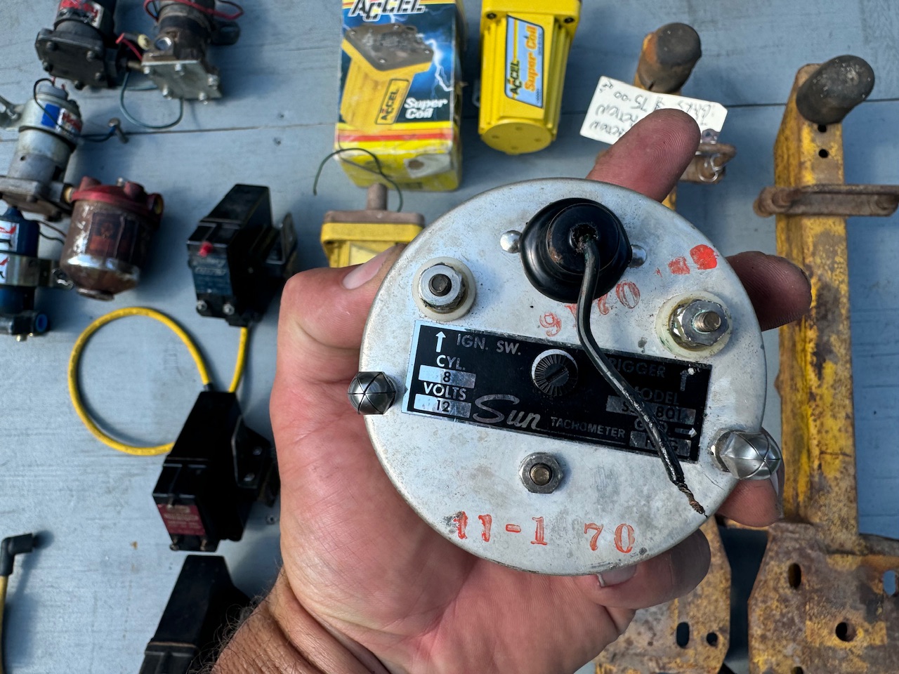 My haul is: 5 Accel Super Coils, 1 NOS from the late 80’s. 2 Mallory VoltMaster 2 coils. I wish I found a couple more. I love these coils but they seem to be tougher to find and higher priced. 1 Mallory Rev Pol Transformer. 4 Holley Blue Pumps. They all run when 12 volts is connected and can easily be rebuilt if needed. All 4 cost far less than the price of 1 new one probably made in China. 4 old sets of Mallory points and NEW YC style condensers. I have no idea what these kits are for. But the old style condensers are a huge score and I love the old Mallory Double life and Rev Pol distributors. 1 Sun SST-801. Orange needle tach built in 1970. In nice shape. I’ll test it but I doubt there’s anything wrong with it. Movement seems very nice. 8 sets of Accel Points and 2 caps. All NOS. I love old points because they’re built much better than new ones. I’m friends with a gentleman that does high end Mopar distributor restoration. He won’t use a set of points manufactured in this century because the quality went so far downhill. 1 set of Lakewood Traction Action Bars. Not sure what they’re for but hopefully they’ll work well on one of my AMC’s. Speaking of AMC, if you have an AMC double life of Rev Pol distributor you’re interested in selling reach out and let me know. Hope you all enjoy the photos and if you can add any info to anything I purchased I’d love to hear it. I’m always interested in learning more about parts built decades before I was born. Thanks guys.