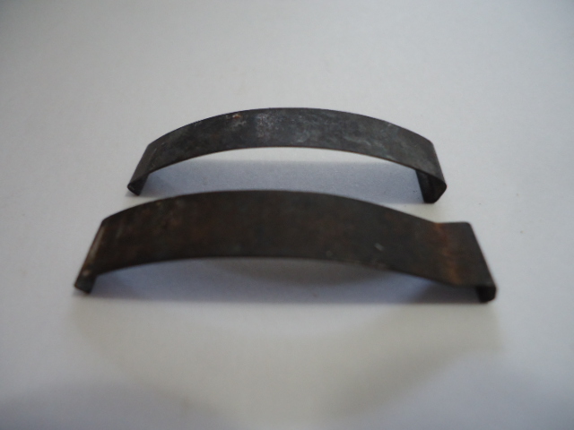 Stay away from HEATER CONTROL LENS spring clips,as they are similar but not the same & won't fit..>https://www.npdlink.com/product/spri...3-repro/198984 Here's the 4 clips I searched high & low for back then at a few local swaps. The ones first on the bottom of this pic with the unique squared end bend are for the top of the radio lens. The Back clips in the pic are for the bottom of the lens. |