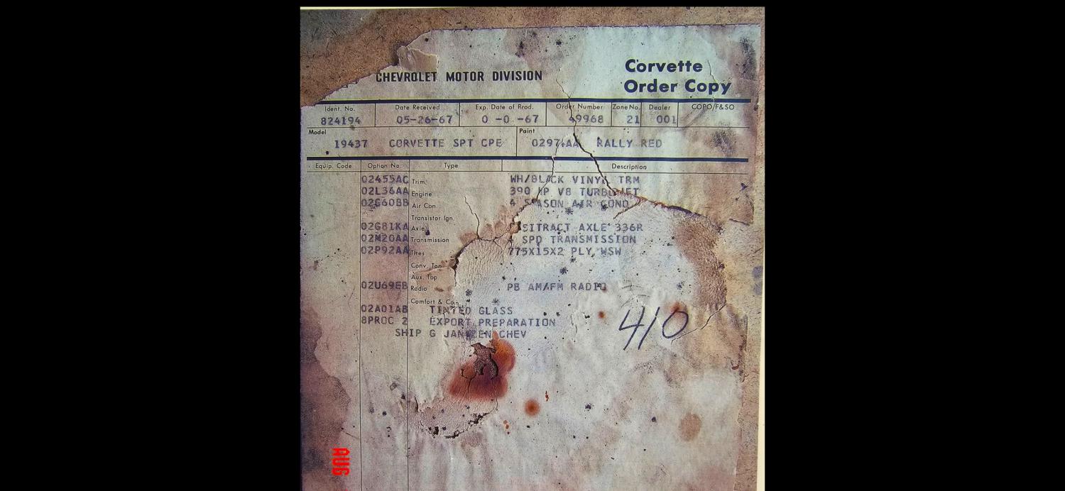 All ECL codes are correct inc. trim 2455 ECL code. Hand written job number falls within correct 3-digit job code. Ident # falls within range of VIN. Dealer zone and code used for Jantzen Chev who was used for Export Preparation, 8PROC 2 also used for Export Prep. Only thing I don't like is the Exp Date of Prod. format. and lack of date. Very close VIN's have Exp Prod date of 6/16/67, 6/23/67, 6/30/67 or 7/07/67. Paul