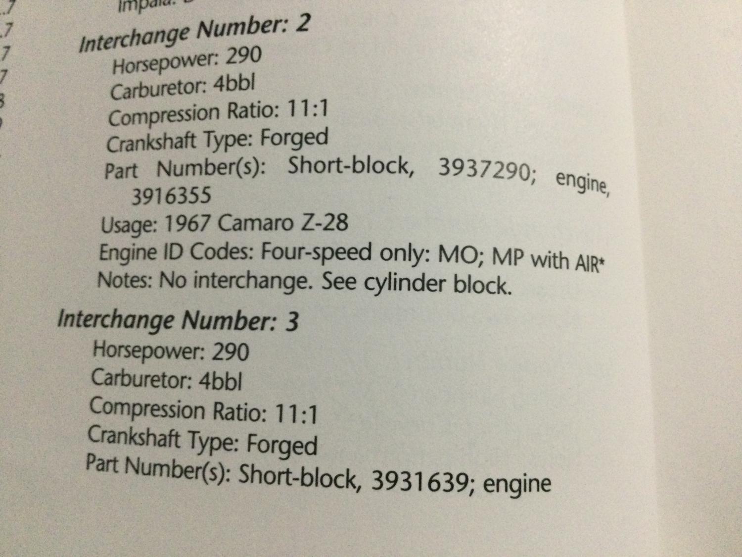 That interchange info is not helpful to the topic at hand nor is it accurate. As an example, I've seen 5 different blocks used in 69 Z28's - it shows 2. CBTN is more informative.