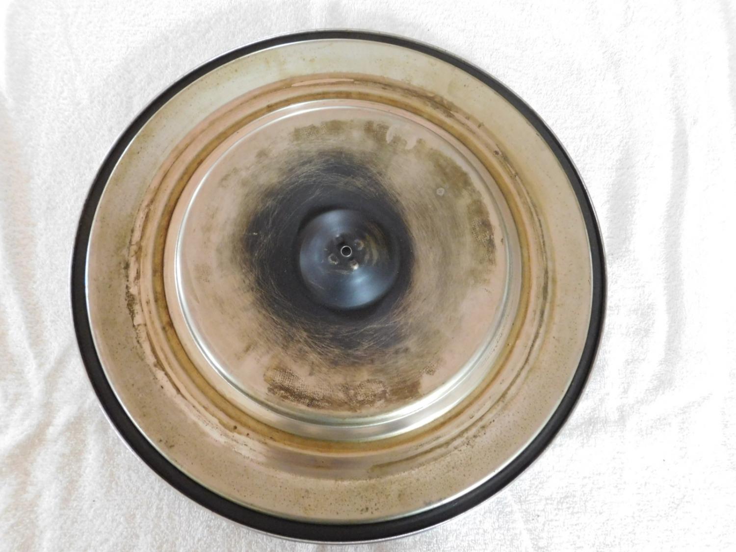 I've cleaned those lid bottoms up to look like new with 0000 steel wool and wax. Working lightly makes it look like new. Be gentle around the stenciling.