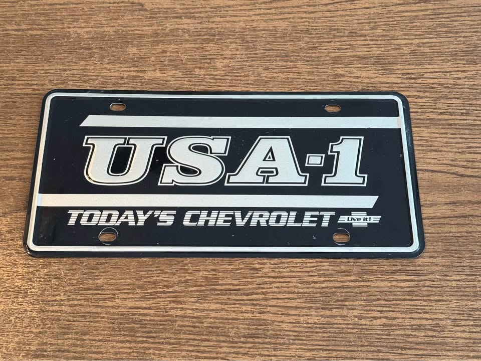 Black USA-1 "Today's Chevrolet" Aluminum small whole original dealership Plate. Overall, nice, used condition. A Few paint blemishes but a good straight plate, that doesn't come up for sale often. Asking $85 Shipped.