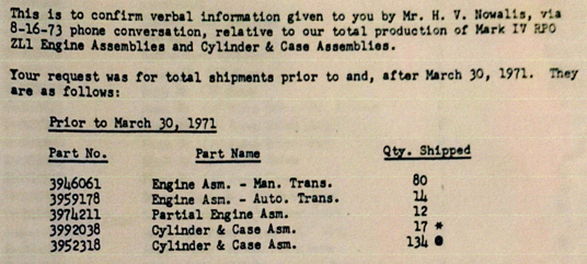 Anyone know the original part number or references for an original RPO ZL-1 short block assembly sold back in the day ?? 1969-early 70’s