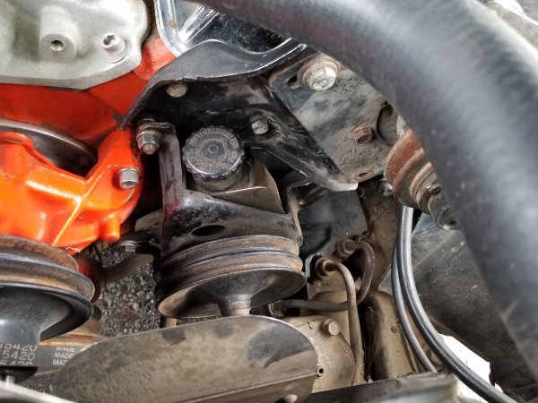 This is a 77-81 SBC adjuster bracket. It bolts to the first exhaust manifold bolt and connects to the the main A/C bracket. The adjuster slot is for the P/S pump.