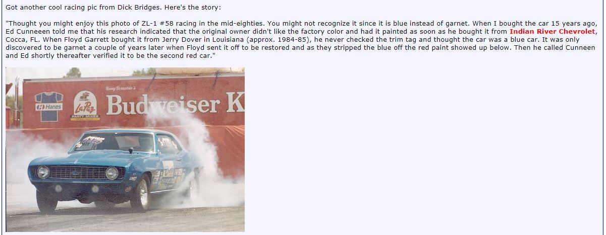 #7. This COPO was sold new at Funston Chevrolet in Detroit MI. It was the September 2002 feature car on this site and it was featured in Chevrolet High Performance in the April 2004 issue. It has a 715 blue interior and it is an automatic car with a console. I believe the original engine exists, but it is currently running a ZL-1 and terrorizing the Factory Stock racing series. It has run as fast as 11.50's in Factory Stock trim.