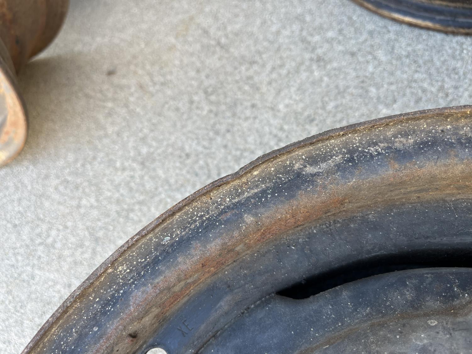 I have a set of four 4 Chevelle disc brake plain steel wheels - the so-called dog dish ones available here. El Camino trucks too. They spin straight and have only a minor rim nick or two as shown. One sat for the longest time face up and rusted a bit in the spider web as also shown. All lug holes good and not wallowed out. I believe these are SS / SS396 plain wheels - they will certainly clear disc calipers - both four and single piston versions of 1968 and 1969. Will fit many other GM cars of the era as well of course. Three are Kelsey Hayes rims, one is an NI Norris Industries N19; see photos. Not getting any easier to find, these... A couple of the "XE" stamp are lighter, as shown. Clearer in person; takes some imagination through these photos; sorry about that. The inside hoops and beads of the wheels are very nice - I recently removed three ancient tires. Two bumps by the valve stem hole on all as well, of course. These are absolutely as found, and I suspect, original black paint - but, of course, I cannot be totally sure on that - just using context clues. Take a look at the photos again, these are hard to find rims anymore, IMHO. Could be vigorously cleaned and used as-is - these are priced less than repops... also, a good starting point to totally restore as well. Cheers Friends, Anthony |