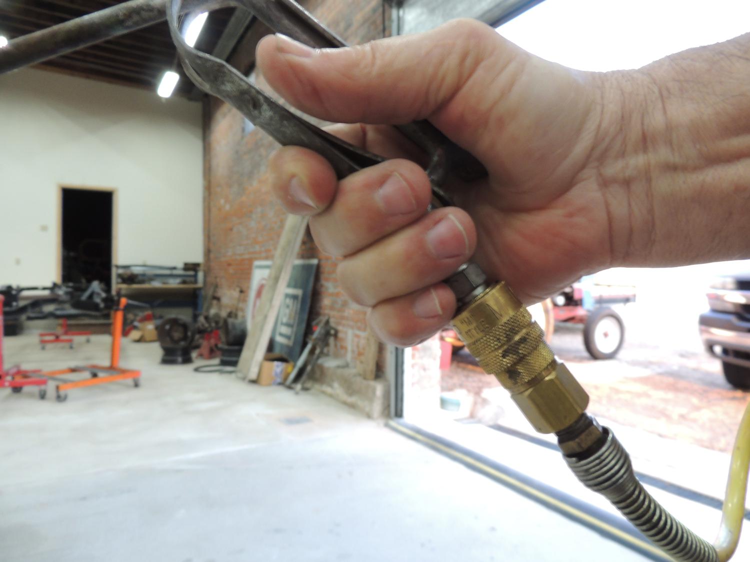 Looks like and air gun of some kind, but how in the world would you attach an air hose? Same thing is available as part of an oil can with a nozzle on the end. Looks like it would spray oil EVERYWHERE!!! Look here: https://www.ebay.com/itm/306368333847 and here: https://www.ebay.com/itm/205202203449 Also a painted one on ebay: https://www.ebay.com/itm/116724591885