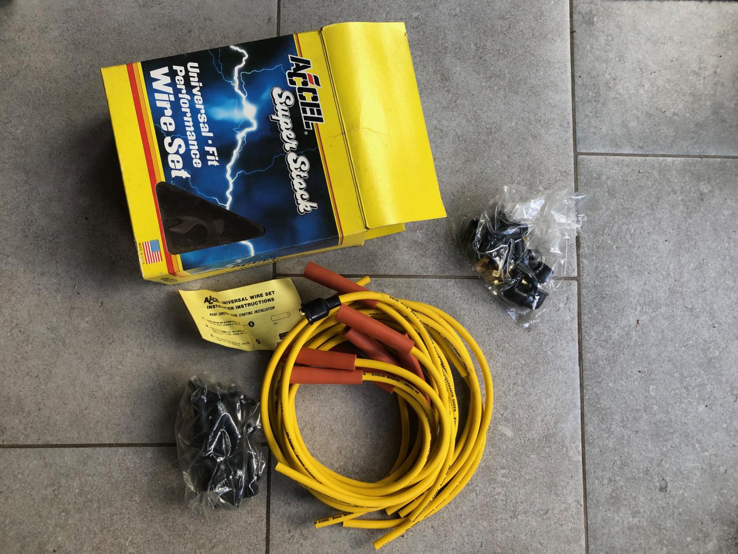 Friends Garage cleanout, old box made in USA, Accel 8mm Silicone wire set w/straight boots 4040. Looks new to me. For V8 applications. Conventional distrib boots bag was opened, but I counted 9 boots and connectors. HEI boots bag was unopened. 8 wires (lengths look correct) and coil wire. $40 plus shipping, Offers accepted. Thx