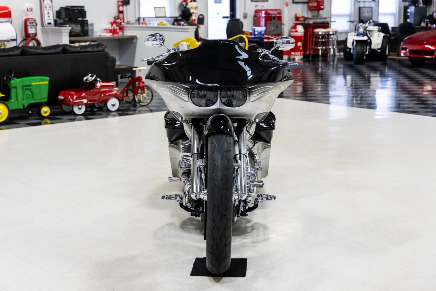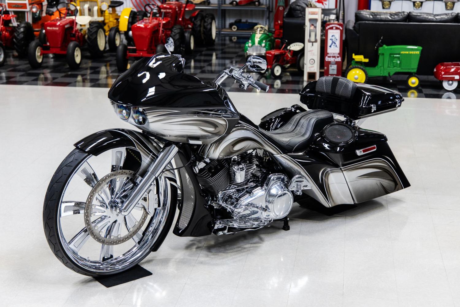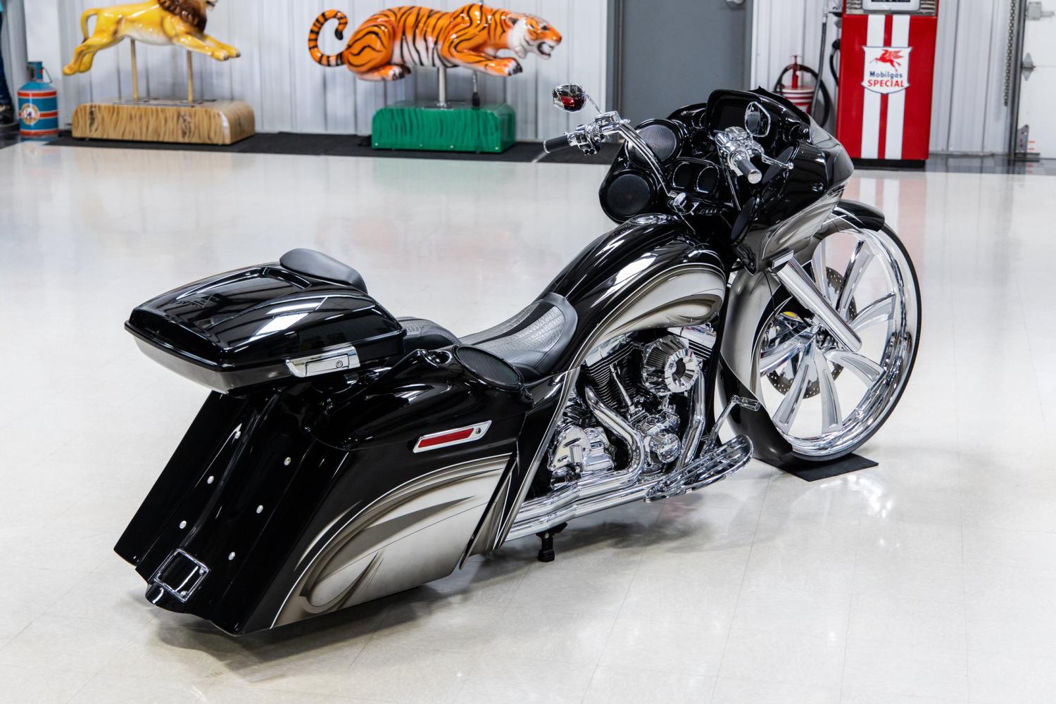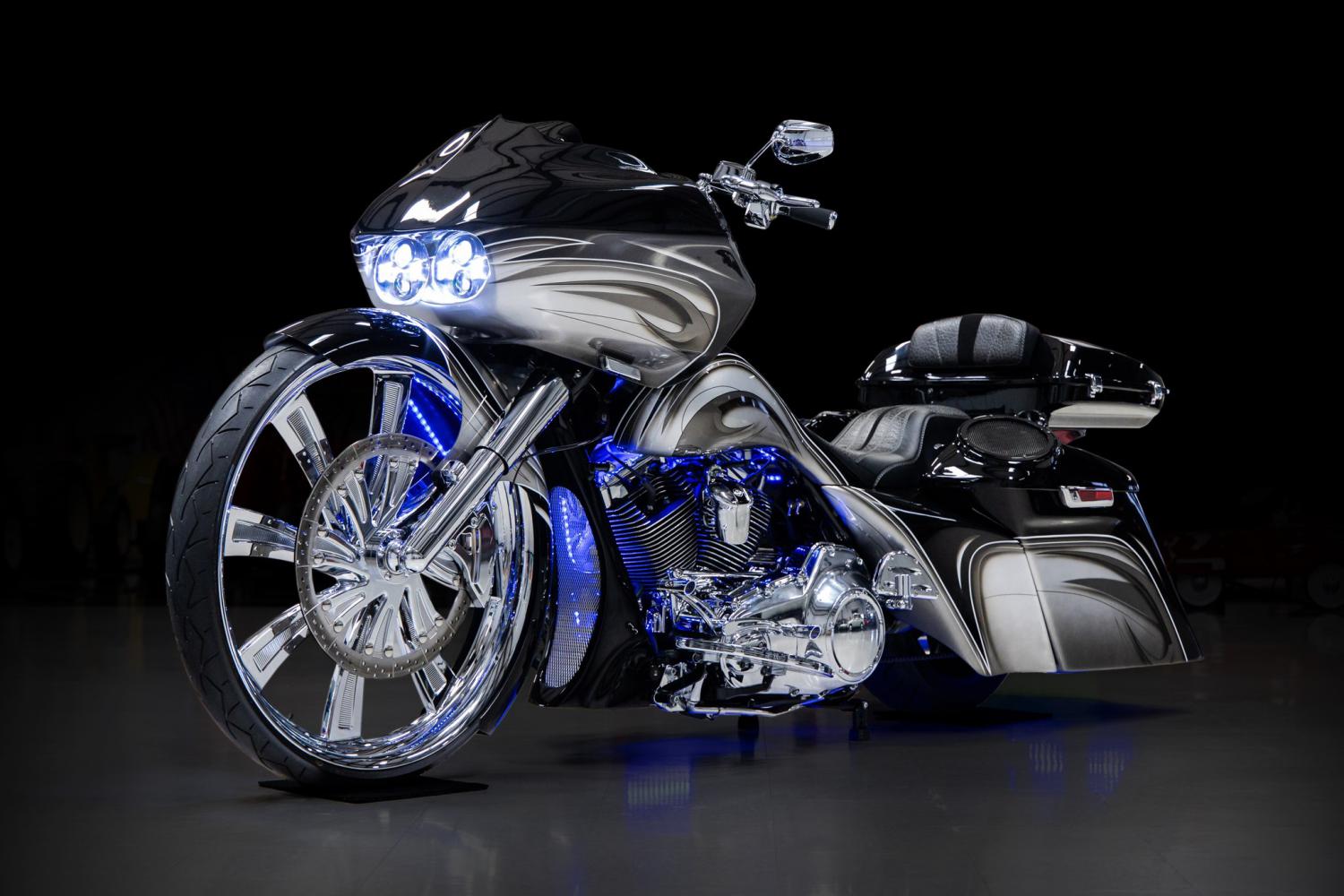 This motorcycle is a spectacular machine that's been built to the highest level of standards. It was designed to appear like it's in motion when standing still. The body modifications include the Evil Intentions Road Glide outer fairing with 30 mounting kit with FLTR Road Glide internal hidden support, double barrel inner fairing, 30 metal wrapped front fender with chrome fender spacers for 30 wheel and HHI legs, BMF chin spoiler, flared sides, saddle bags that are 6 down and 9 back, 6 stretched rear fender. The body panels were finished in Vivid Black with silver, gray, tan and white custom graphics. The beautiful deep paint and graphics is high show quality. It was outfitted with a custom Elephant skin seat that's decorated with swede and stitching. It also was outfitted with a Tour-Pak backrest pad. Some custom features include Paul Yaffe 10 chrome handlebars with Arlen Ness beveled grips, FLTR black LED headlight, Road Glide Super Stock Bitchin Bezel, Dakota Digital MVX 8K series gauges, 2-piece flush pop up style chrome gas cap, Colorwerx 13-piece LED light kit and chrome license plate holder. The Neck Rake Builders kit package for 30 wheel includes a 9 degree neck, 12 degree trees and 3 fork extensions. It's equipped with chrome Bomber fork legs and Fork Bell slider covers. A chrome brake and clutch control hydraulic kit. It's equipped with an 18 polished rotor and caliper kit on the front. It rolls on a front Metalsport Twist 30 chrome wheel mounted to a Vee Rubber Monster 140-40-30 tire and rear Enforcer 16 black powder coated wheel mounted to a 180-65-16 tire. It's been dressed with Arlen Ness deep cut floorboards, pegs, shifter, brake lever and air breather. It was set up with a Dirty Air El Grande fast front and rear air suspension kit. It's also equipped with a MRI electric center stand. The traveling concert concert sound system consists of a Pioneer DVD Receiver with 7 display, Bluetooth and Sirius XM ready, 2- ARC Audio 600 watt 4-channel amplifiers, 4- 6.5 Hertz speakers, 6- 8 Hertz speakers and 4- Hertz tweeters. It's powered by the original 103 cubic inch (1690cc) air-cooled Twin Cam engine and a 6-speed Cruise Drive transmission. The cylinders and heads were diamond cut. It was decorated with a chrome primary cover, cylinder base cover, head bolt covers, points cover, starter cover and motor bolt kit. It's was also decorated with a cylinder base cover, rocker box cover and transmission shroud cover. The engine breathes through a D&D Performance Boarzilla chrome exhaust system.