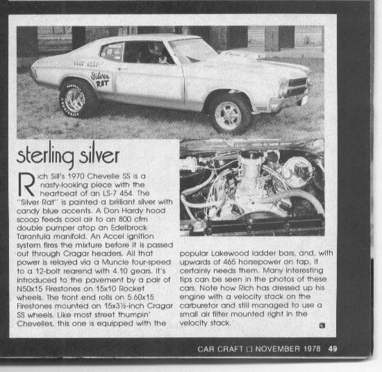 Saw this writeup in an old Car Craft Nov '78 special Chevelle issue. '70 Chevelle SS LS-7 454. Notice the words Phase III on the hood scoop and the Motion valve covers with emblems. Wonder if this car was a transplant or bought through Baldwin. Car owned by a guy named Richard Sill's. Man this is just how I remember these cars were set up.