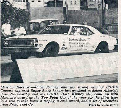 Canuck; If I won the lottery and could retire tomorrow, I'd dedicate all my time to the Canadian Motorsports Hall of Fame. I was there this winter when it was at the CNE grounds and was very disappointed. I'm a Drag Racing collector, and there was very little there on the sport in Canada. Two of the biggest Canadian CHEVY drag racer's from the 60's weren't even mentioned in the museum or their book. Attached are photos of Lance Hill (Toronto) and Buck Kinney from Vancouver. These guys ran the and won with bowtie cars when both Ford and Mopar in Canada were heavily financing their own teams (John Phillipps Titanic Ford Team and John Petrie's Mopar High Performance Clinic). Lance Hill was teamed up with Dick Arons (Booth-Arons Fame)and was a corespondent for Wheelspin News and National Dragster. These were both 396 cars. Both photos from Wheelspin. ...............Bill
