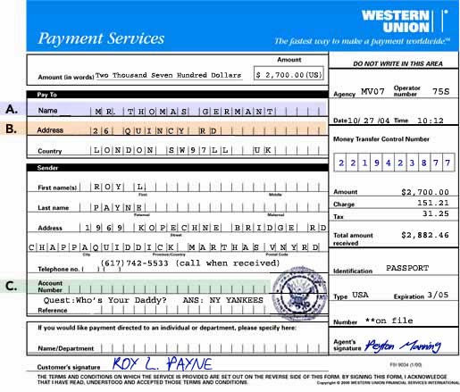 The "sale" item was a 1971 Ford 302 engine. ![]() Fellow sYc forum member "ED&KEN" (Ken) sent me a PM: [ QUOTE ] I was SELLING the engine on eBay....he sent a phony second chance offer to one of the bidders....the bidder forwarded it to me. I replied to the guy telling him I wanted to buy MY engine from HIM. Now he is offering to sell me MY OWN ENGINE!!! ![]() [/ QUOTE ] So I contacted the scammer and pretended I was a 3rd bidder and had learned that the first buyer had defaulted. I was offering $2700 for the engine. (Yikes! It is afterall, a FORD! ![]() Anyway, Ken and I started baiting him from our own ends and strung him along for a week. Ken was "Rob Myeorgan" ![]() I was "Roy L. Payne" Ken was delayed in sending $$ due to rectal problems, whereas I was delayed when I was hit by an errantly-tossed beer bottle after the final out of the #4 World Series game in St. Louis. ![]() On top of that, when I awoke in the hospital, my pants were undone! ![]() Ken sent off his bogus Western Union receipt for $3K yesterday, while I waited until today. This way we'd have him running for two days straight! ![]() But on top of this, I sent him an intentionally blurred version of the WU-Xfer so he couldn't read it. Now he'll have to wait one more day while I transfer a readable version. The new version of the (attached) Western Union-Xfer will be in TIFF format - at about 4 MEGS. This will ensure that he spends a good half hour downloading the file in his filthy, stinking rathole Internet cafe. ![]() I hope he's paying a premium and is on dial-up access! ![]() Anyway, I wanted to thank Ken for coming to me with this scammer and for the fun exchanges we had in making this scammer miserable! ![]() ![]() ![]() eBay Scammers---> ![]() Thank you for reading this. Mac