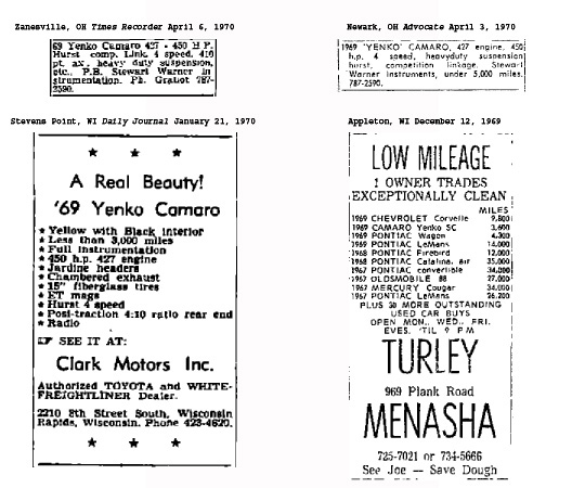 The two ads on top are for the same car, the phone # is the same, Gratiot is just a little crossroad between Newark and Zanesville. This might be the RG Yenko sold new in Columbus. See the last 2 pages in this thread. https://www.yenko.net/ubbthreads/show...81/#Post136459