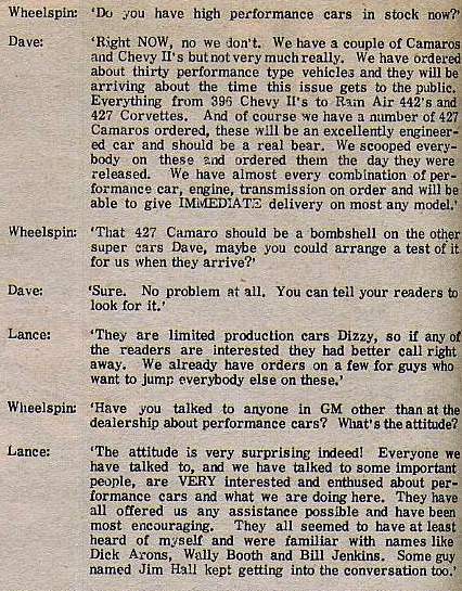 Hey Group; New Guy Here; I have a Wheelspin News from February 1969 with an interview by Dizzy Dean Murray (publisher), Lance Hill and Dave McKay (Belmont Hi Po Sales Manager). Hill and McKay mention the COPO Camaros on order. Also, in the same issue Maurice Carter Chev in Hamilton Ontario has an ad for 427 Camaros and Chevelles. The ad states "order now for March delivery". ......Bill