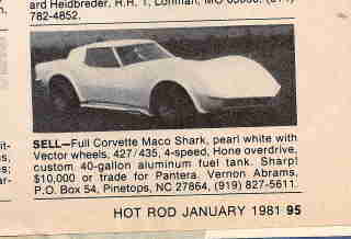 It is apparent that real Maco sharks done by Motion are far and few between, so the first question I have is if Motion was the only shop to sell maco shark fiberglass panels and such? If so, I think I have found a very old add containing either a motion-modified corvette, or just a corvette with maco shark glass added to it. The add is from the January 1981 edition of HOT ROD magazine, in the classifieds, or ' HR Mart ' section. All the information included in the add will be in the picture I have attached.... ....And this is the third time I have attempted to attach it, with no luck. Seems the file is too large and I cant figure out how to make the file smaller. Anyone I can send this to so they can post it? I'm wondering if this car still exists.
