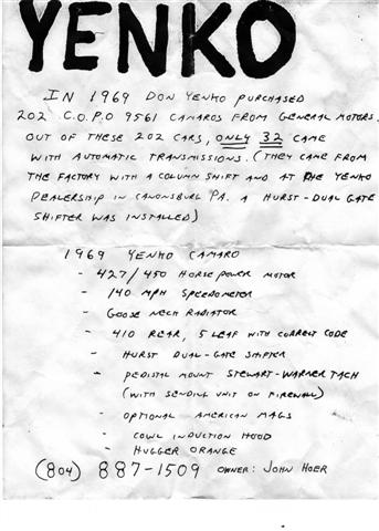 This is the flyer that was on the windshield of this '69 Yenko Camaro. It looks like the plate says '89, it was sometime around then.