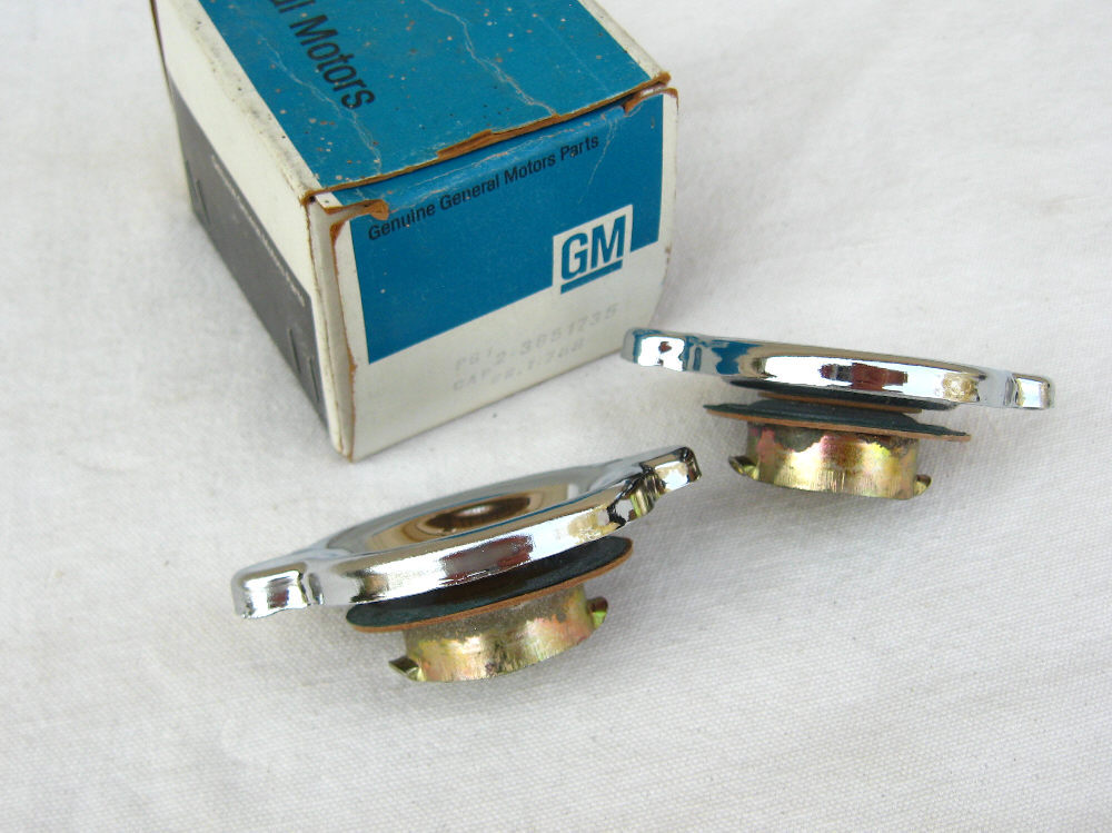 (2) NOS GM chrome oil filler caps. Vintage NOS with "S" in the