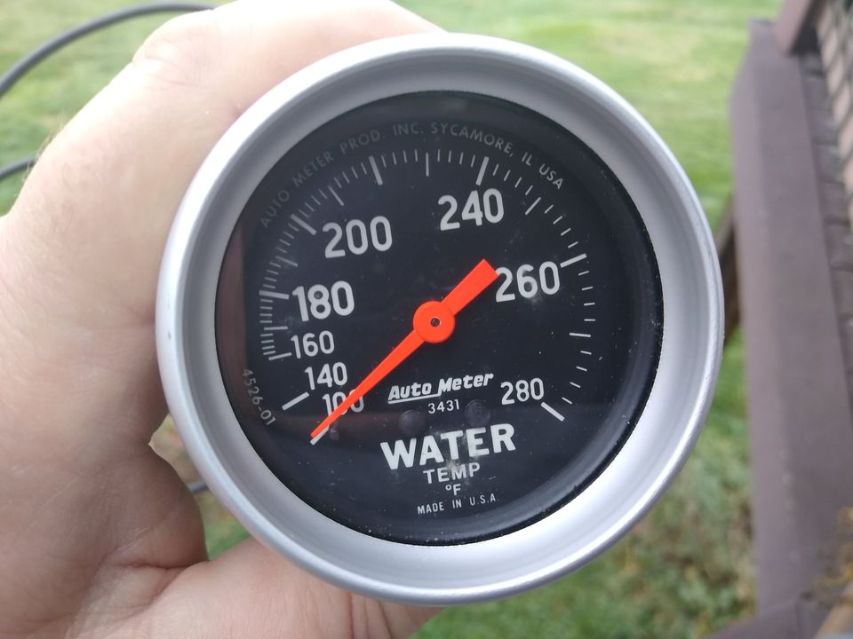 Oil and gauge panel is NOS, Water is used. I tested it, it works-put capillary end in boiling water. Water white lettering has some very faint yellowing. On a scale of 1-10 a 1.5. Really hard to notice. Water bezel has no dents or scrapes.