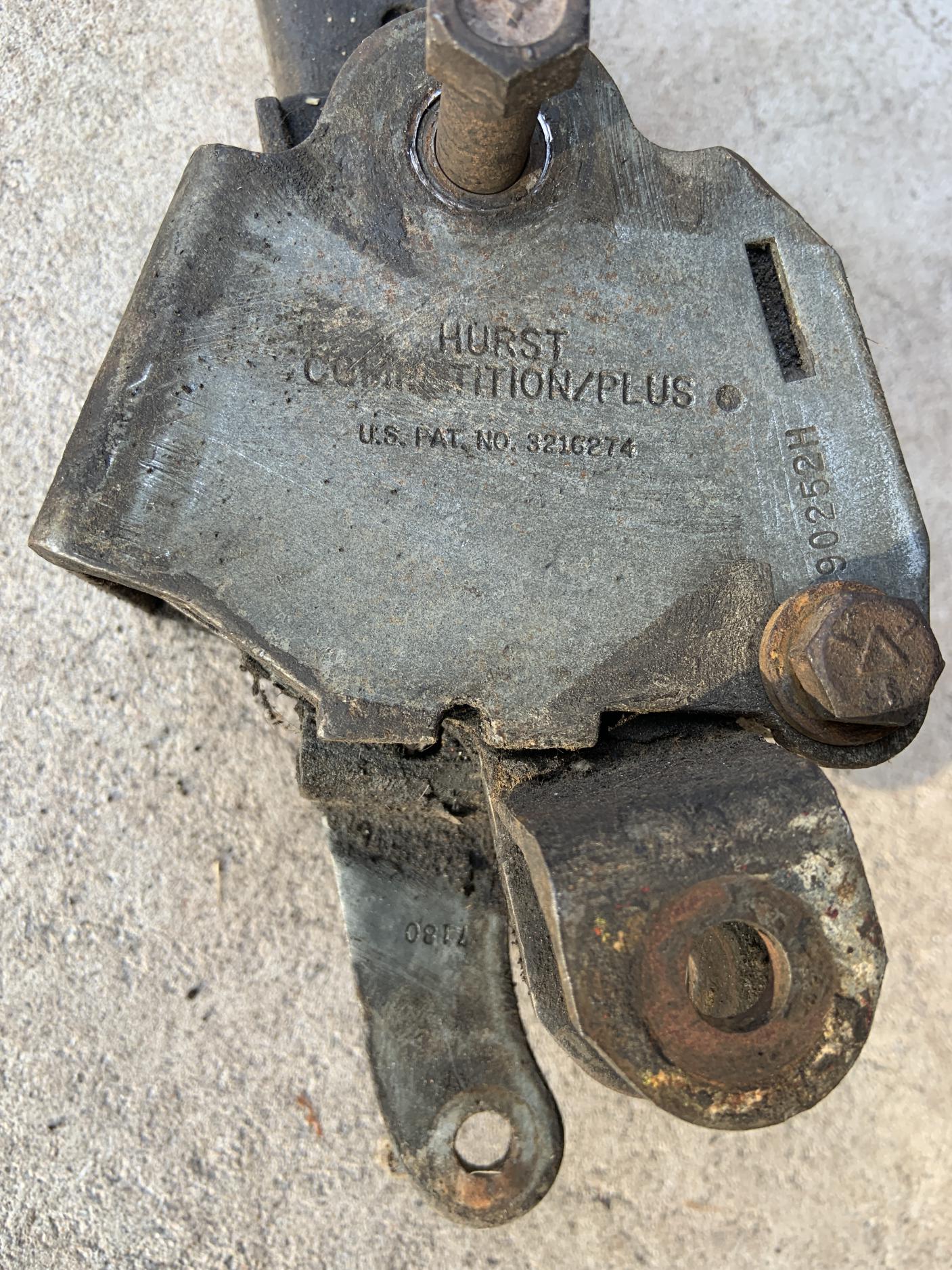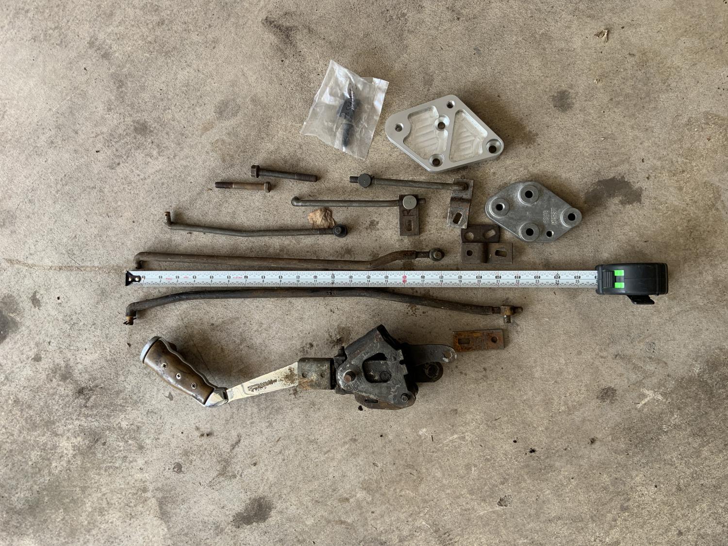 Cleaning out my garage and came across this original early 1970 push-in mounting style, E-Body (Cuda and Challenger) pistol grip shifter with the "7180" stamping on the reverse lever and various parts that I have accumulated. Includes original 6348 B-Body and reproduction E-body mounting brackets as well as a bunch of linkage arms and rods and mounting bolts.