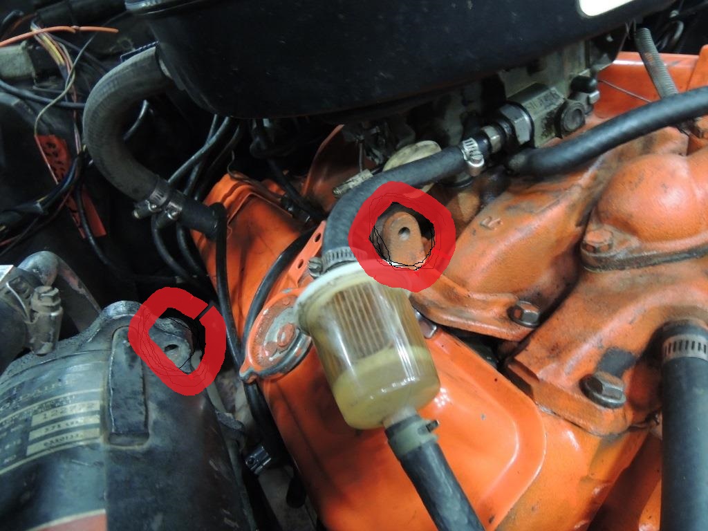 Attached are pages from the '67 AIM along with pix from a '67 327 that I have no reason to believe has ever been apart.The foremost manifold bolt has a 3/8" stud to mount the bracket, no spacer. The second manifold bolt passes through a 3/4" spacer. |
