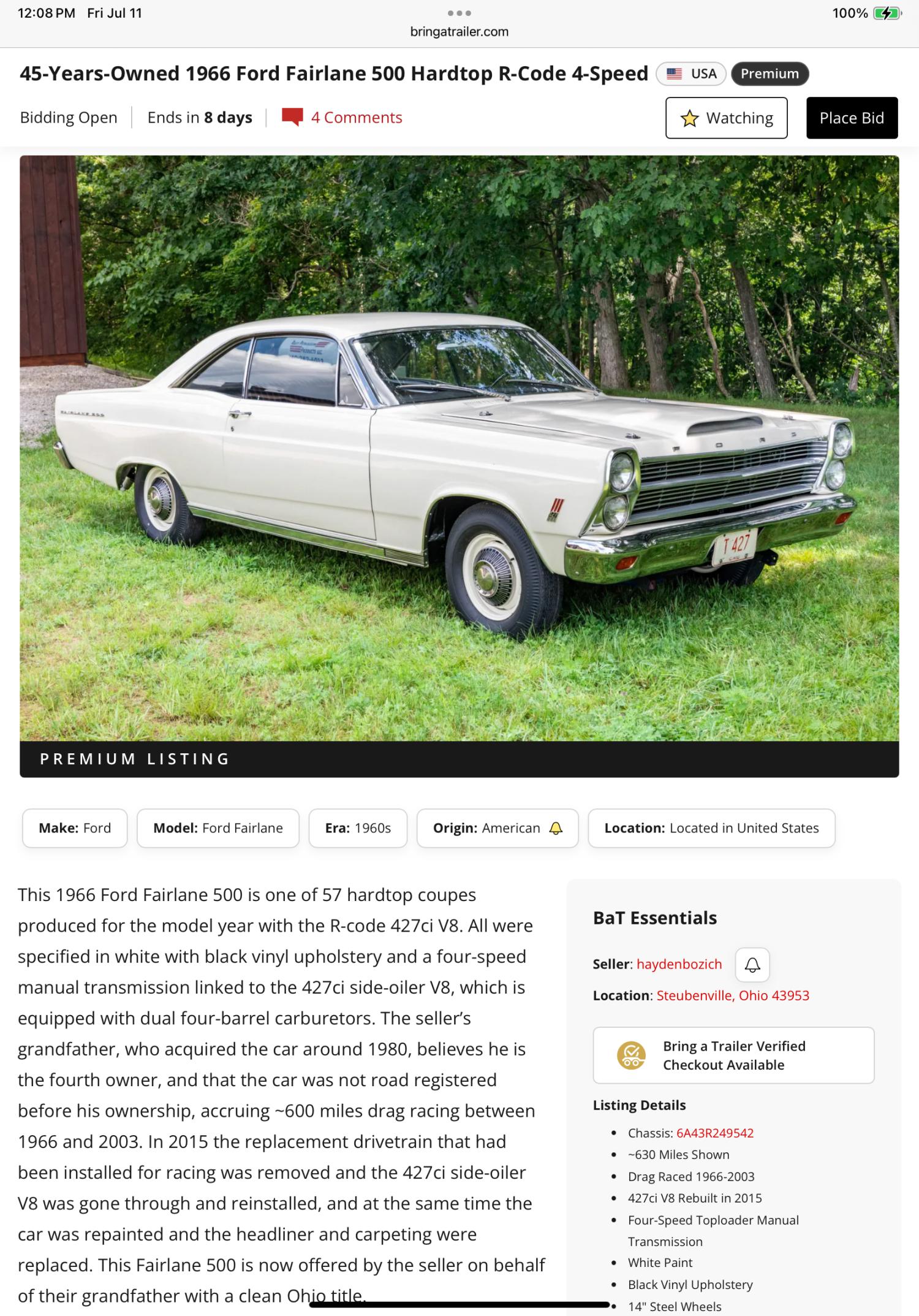 One of the ‘66 R code Fairlanes popped up on BaT. I don’t think I’ve seen this car much prior to this, sounds like it has a known history, build sheet, etc. I’m curious what it does, they typically bring more than ‘67s. https://bringatrailer.com/listing/19...airlane-500-9/