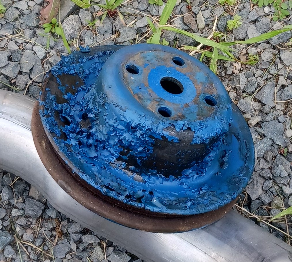 The smaller bracket in middle pic is a match for the one on the Chevelle. Well other than being a bit bent up. Bolts were obviously out on the Chevelle when the Lemans blue lacquer was brushed on, but all have orange paint showing. Pulleys and alt brackets also got the blue treatment. Upper pully getting the old Aircraft stripper treatment. Did not take pics of the bell bolts but this is one of the end exhaust manifold bolts. Bell bolts were in better shape. |