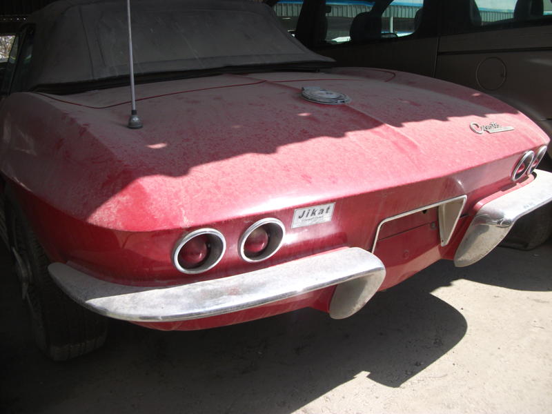Looks like a '66 Vette with a '67 Big block hood. Recent Illinois plates, and has all the earmarks (knock offs, stinger hood, red paint, sidepipes) of a fluffed up auction car from 10 years ago. Appears to be having as good a time in Jordan as that Midnight Express fellow had in Turkey.