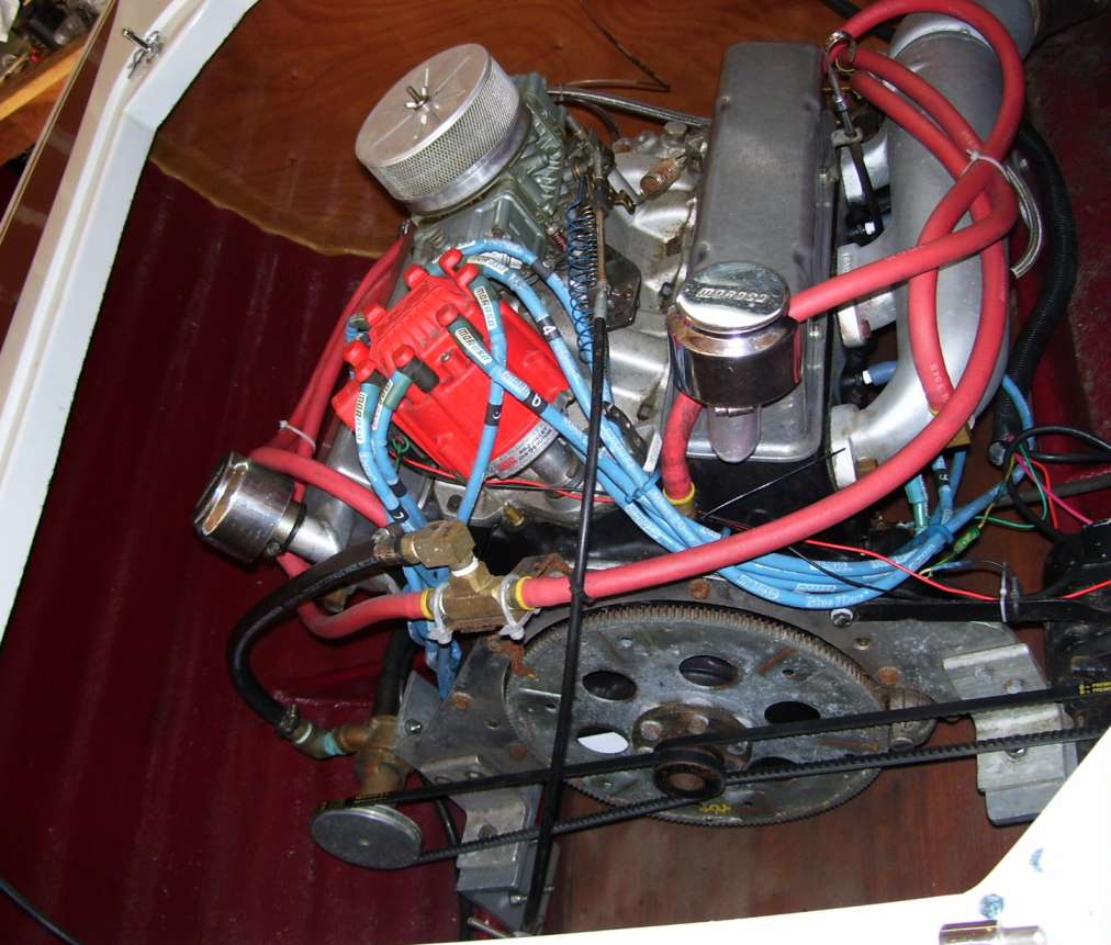 So I've actually had a chance to get the boat out on the river 3 times already this Spring and it's a blast. I still haven't gotten the gas pedal all the way to the floor yet, this thing has too much power so I'm just getting a feel for it while there is nobody else out on the water. I can't imagine racing one of these, I've seen some wing outs and even with a roll cage and being strapped in, guys get banged around pretty good. Here are some pictures of the motor and if you notice, it's in backwards. The distributor end is facing the front of the boat.