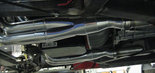 468 BBC, Keisler 6-speed, Fab 9 rearend with Chassis Works 4-link and front suspension crossmember. We added Vintage Air, tilt column, adjustable pedals and custom headers and exhaust. Most of the parts on the car came from shut down Cup teams.