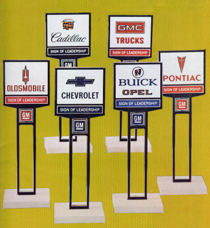 In September 1969,General Motors implemented a plan of standardizing the look of GM dealerships.The "Signs Of Leadership" are shown here.In fact the signs you are viewing are 1:25th scale models that were made and distributed around this time.They were often seen on salesmen's' desks.Today they go great with scale model dioramas and promo car collections.They aren't easily found,but I would aim for toy & model shows too.