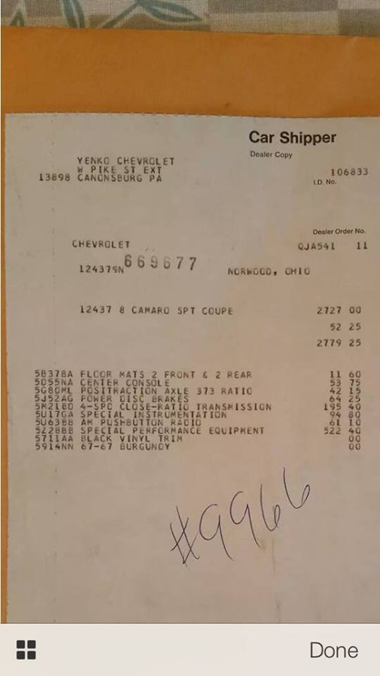 a yenko z-28 is really cool. a ncrs shipping document makes it that much better
