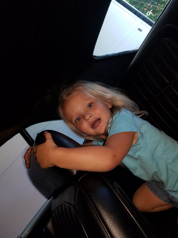 My granddaughter had her first sleep over. In the morning I was building a wooden play set for her (7hrs so far). Anyway I decided to take a break and put her in my 69 LB L78 Camaro. Well she fell in love with the car and was not too happy when my son in-law took her out.