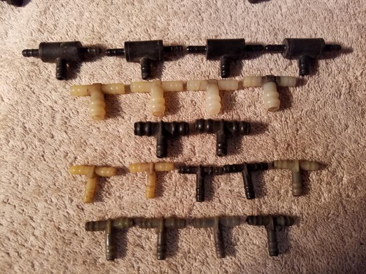 All original very hard to find none of these are being reproduced. Top row headlight washer Barrel check valves. $80 each. Second row 3/16 inch straight pipe 1/4 inch downpipe vacuum hose Tee, 40 each. Third row down 1/4 inch straight pipe 3/16 inch downpipe vacuum hose tee, 40 each. Bottom two rows 1/8 inch headlight washer hose Tees, 30 each.