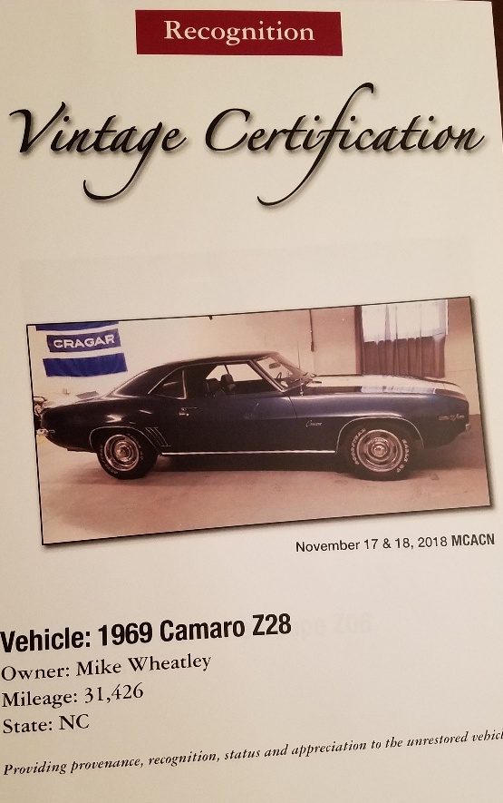 Vintage Certification™ is a judging program whose sole purpose is to recognize, provide status, provenance, and promote un-restored (survivor) vehicles. We believe it is the only program that focuses on documenting and benchmarking these cars. Our core certification team consists Brett Merryman, Paul Martin, Steve Minore, Chris White, Scott Tiemann, Frank Badalson, Steve Shauger and other marque specialists based on make and model. Each core team member possesses over 30 years experience as restorers, collectors, historians and judges in the hobby. Typically we spend 3hrs examining in detail every segment of your car including the underbody on a lift. To learn more about Vintage Certification visit our website at www.vintagecertification.com or the MCACN website at www.mcacn.com. This is the perfect venue to have your vehicle certified. You will be among and exclusive group of enthusiast who participate in this exciting event. We understand not every original car is 100% untouched, and we offer five levels of certification, based on the originality of the Vehicle. Vintage Certifications™ five divisions: Vintage Time Capsule - Vehicles that are 95+% unrestored in all reference areas Vintage Legend - Vehicles that are 85+% unrestored in all reference areas. Vintage Heritage - Vehicles that are 85+% unrestored in four reference areas. Vintage Legacy - Vehicles that are 85+% unrestored in three reference areas Vintage Reference - Vehicles that are 85+% unrestored in at least one reference area. Reference Areas: Certification consists of two areas of consideration, Originality and Preservation. Reference areas are as follows: • Engine Compartment Area • Exterior Body • Interior Body • Underbody • Trunk (except Corvette) Preliminary list of participants: 1962 Impala SS 409-409 Convert 1965 Corvette L78 Black 1967 Chevelle L78 triple black 1967 Corvette 390 Marina Blue 1969 Cougar Convert 390 Gold 1969 Z28 Dusk blue 1969 RS/Z Hugger Orange 1969 Copo Hugger Orange DH 4spd 1969 Hurst Olds 1970 Cuda Hemi 4spd B5 Blue 1970 Challenger RT/SE FC7 Plum Crazy 1970 Road Runner 6bbl B5 blue 5kmiles 1970 LS6 Chevelle Gold I have several others in the queue, so if you're thinking about participating in Vintage Certification please contact me ASAP. Email [email protected] or cell 63one-514-9765
