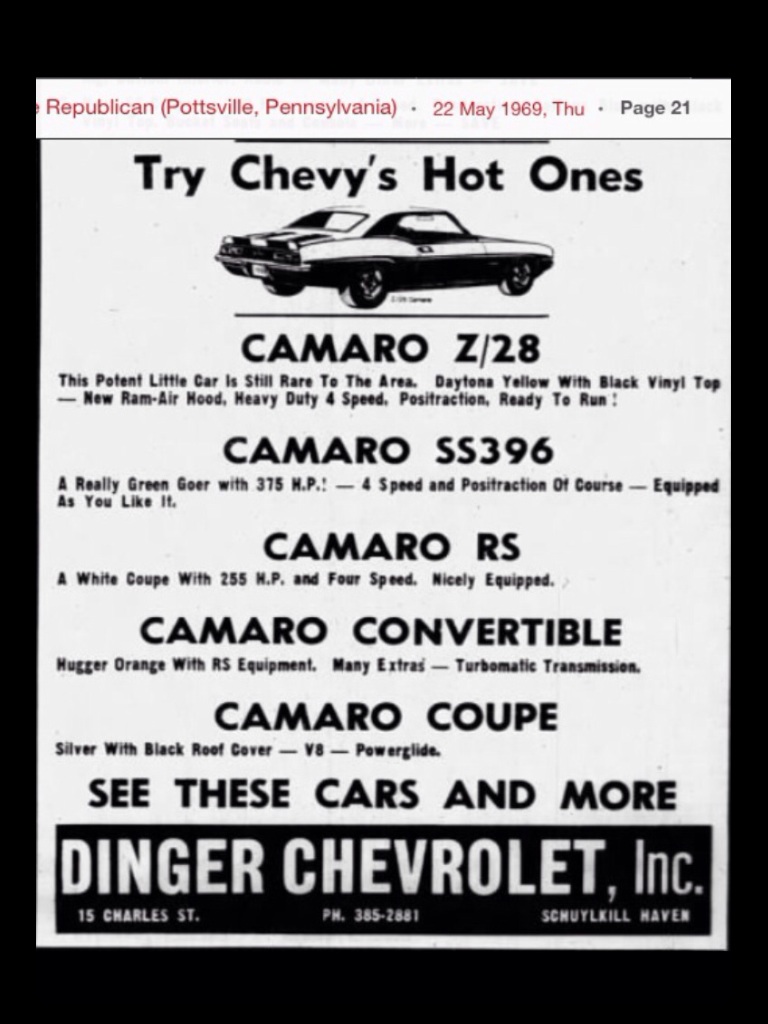 As R68GTO noted, most Dinger ads are for used cars but here's a few of the cooler ones I saw. Some are blurry like this May 22/69 ad w/ the '69 Z-28 so included are expanded top/bottom views. What color is your friend's car Marl? ![]() ![]() ~ Pete .