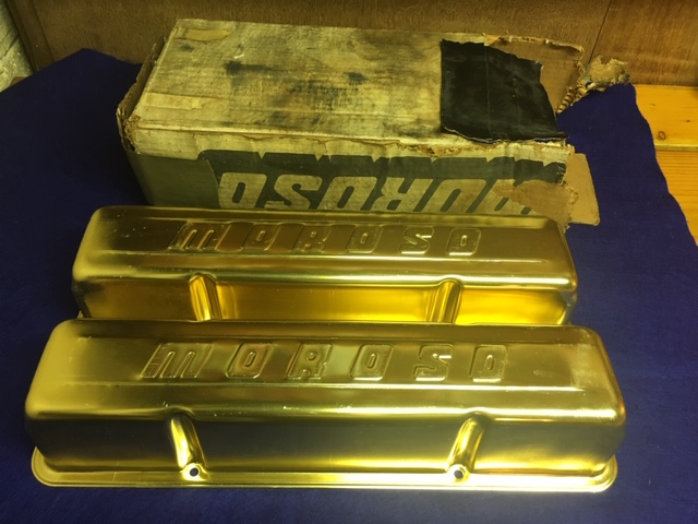 Very early new old stock small block Chevy gold anodized valve covers. Great for an old drag car or for correctness on a true Day2 muscle car.(The early valve covers had the MOROSO letters spaced further apart)