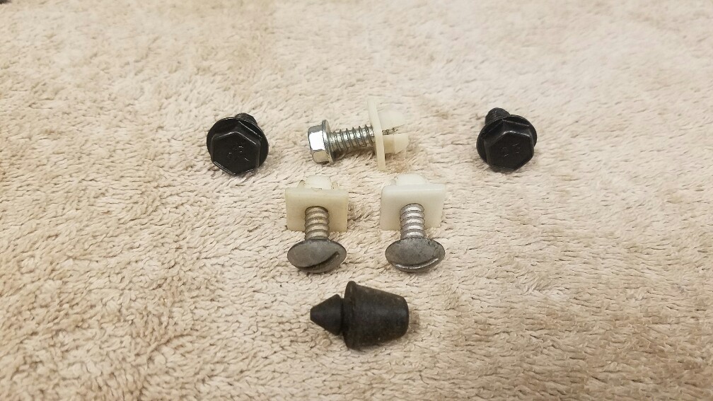 Original front and rear license plate nylon push nuts and screws. First-set are NOS screws and inserts second set is a very nice used original set with great patina for a survivor. $35 a set shipped to the lower 48 if paid with PayPal friends and family.