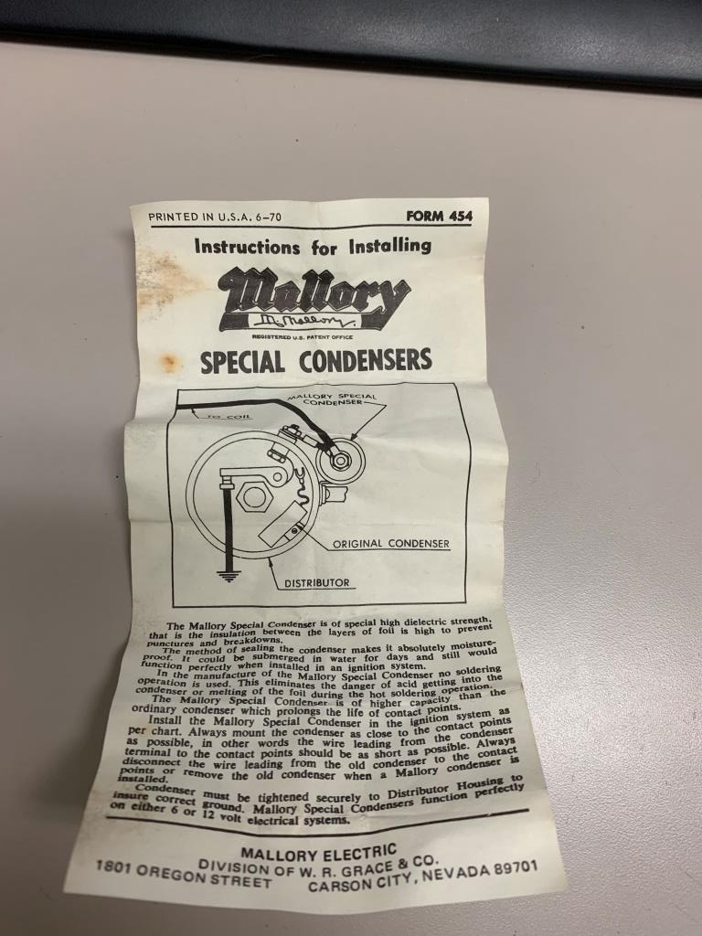 For comparison. Instruction sheets for the Echlin (Mallory) condenser and the Mallory 25010. Note that one was either made or printed in Detroit, MI and the other in Carson City, NV